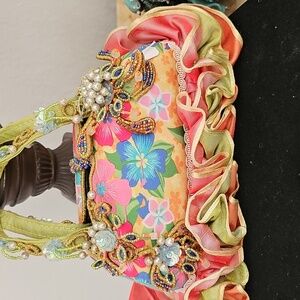 Chic floral handbag with vibrant colors and ruffle details. Perfect for adding a pop of color to any outfit.