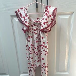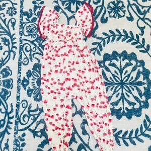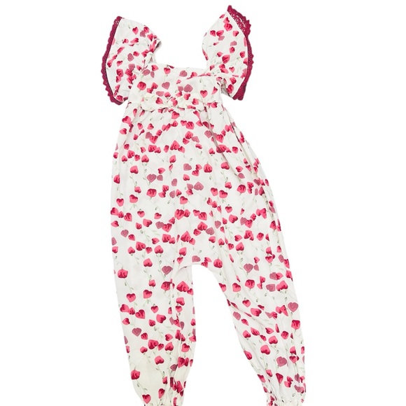 Charming floral jumpsuit with ruffle sleeves. Features a vibrant pink and white pattern. Size 4T. Small blemish on front,