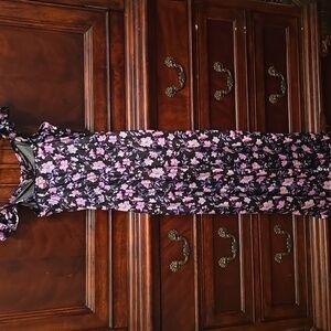 Stylish black jumpsuit with pink and purple floral pattern. Features ruffle sleeves.