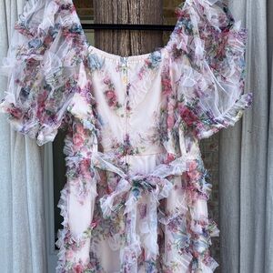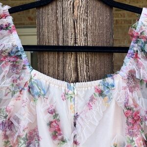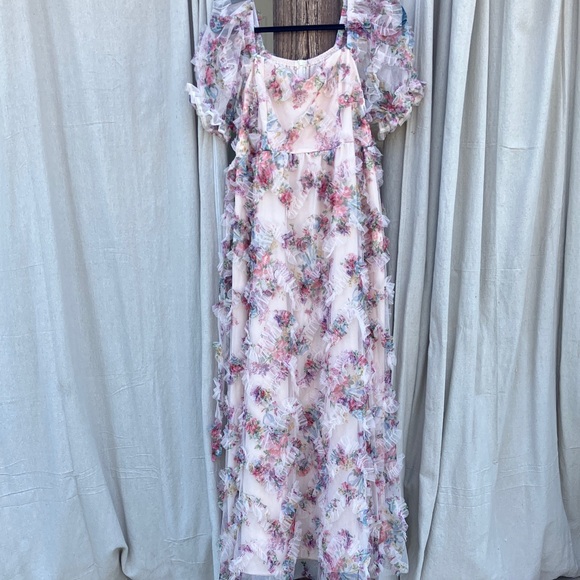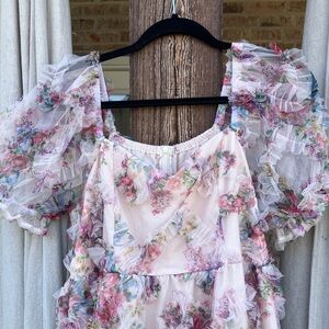 Elegant floral maternity dress with ruffle details and puff sleeves. Very lightweight and comfortable. Worn only once for a wedding and is in excellent condition! Perfect for weddings, baby showers, or maternity photos.