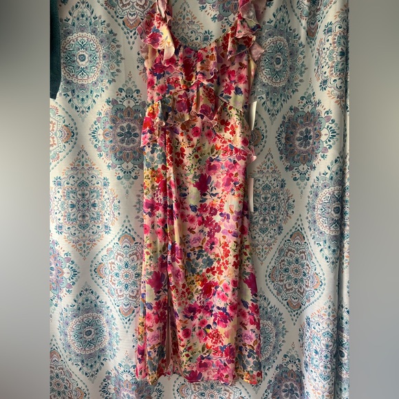 Vibrant floral maxi dress with ruffle details. Perfect for a summer outing.