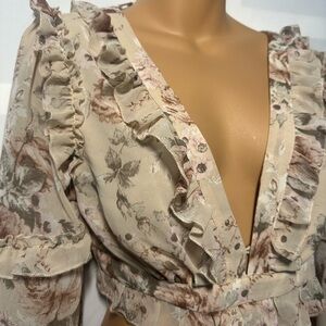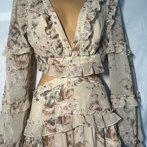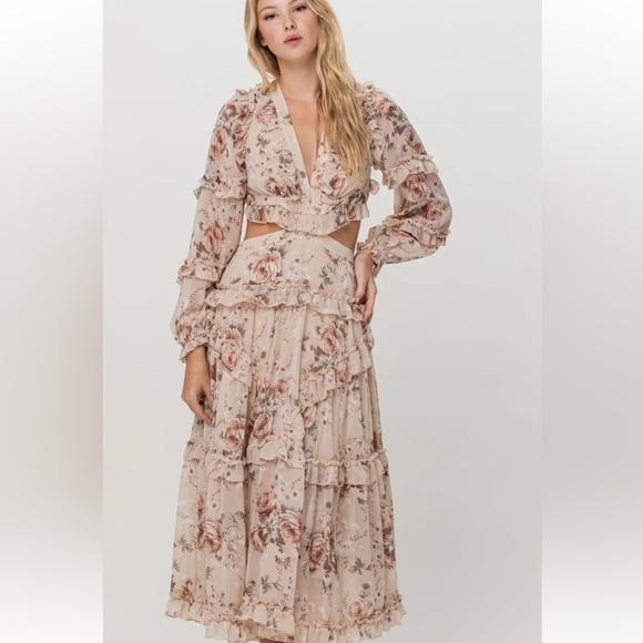 Embrace elegance with this floral ruffle maxi dress. Featuring a beautiful cream base with pink floral patterns, this dress is perfect for any occasion. The delicate ruffles add a touch of femininity.