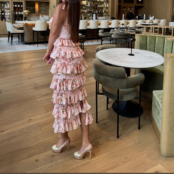 Embrace elegance with this stunning floral ruffle maxi dress. Perfect for any occasion, this dress features a beautiful pink hue that adds a touch of femininity to your wardrobe.