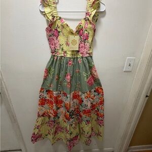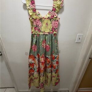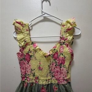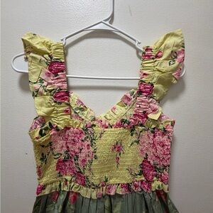 Charming floral maxi dress with ruffle straps. Features a mix of pink, green, and red hues.