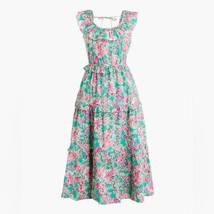 Embrace vibrant style with this floral ruffle midi dress. Perfect for any occasion, this dress features a lively pink and green pattern. Enjoy the flattering fit and feminine ruffle details.