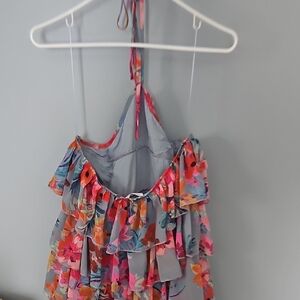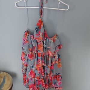 This vibrant floral mini dress features playful ruffles and a colorful design. Perfect for a sunny day or resort vacation. soft buttery lining.