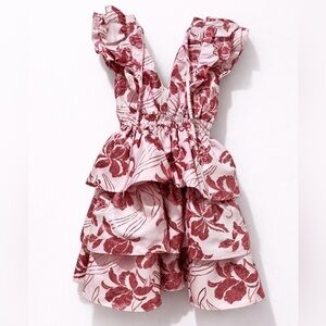Blush pink and rose floral tiered mini dress featuring dramatic ruffled cap sleeves, a flattering deep V neckline, and a cinched waist that enhances your silhouette beautifully. The structured fabric gives it a luxe, elevated feel while the layered skirt adds playful movement and volume. Feminine, flirty, and eye-catching — perfect for graduation, bridal events, date nights, spring parties, or vacation photos.
