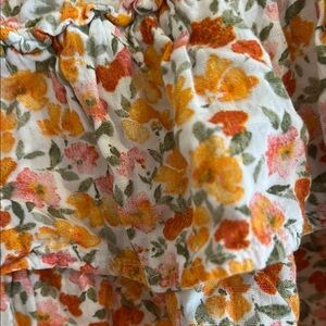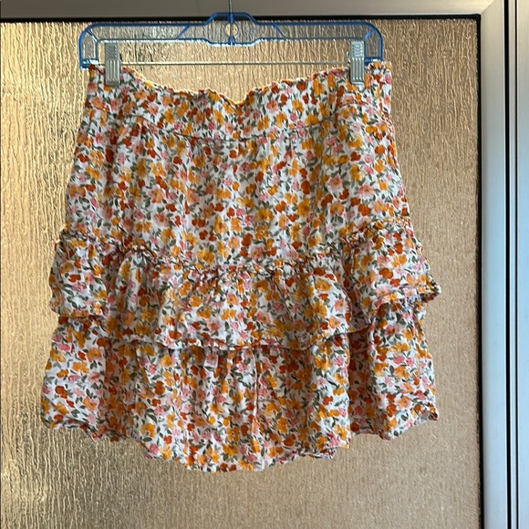 Charming floral mini skirt with ruffle layers. Features a vibrant mix of colors.