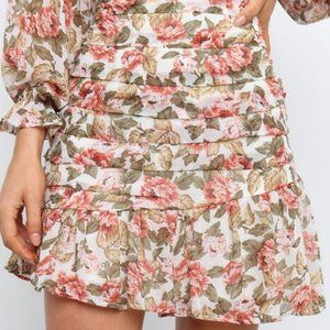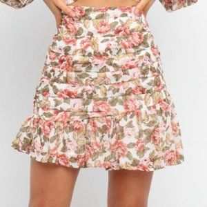Embrace a chic look with this floral ruffle mini skirt. Perfect for any occasion, it features a beautiful blend of pink and cream hues. Pair it with your favorite top for a stylish ensemble.