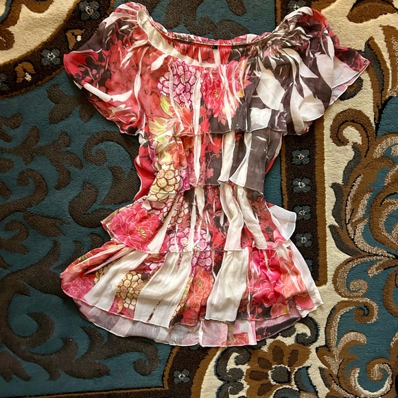 Chic off-shoulder blouse with a vibrant floral pattern. Features shades of pink, red, and white.