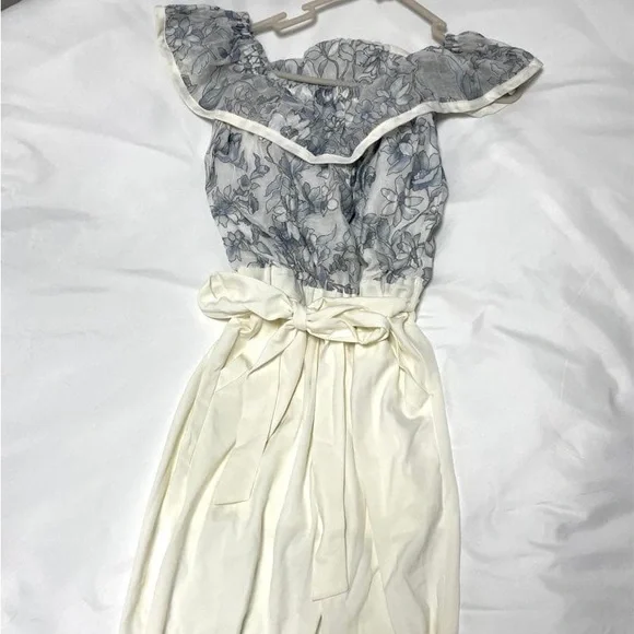 Elegant off-shoulder dress featuring a floral pattern with a ruffle neckline. Perfect for any occasion.