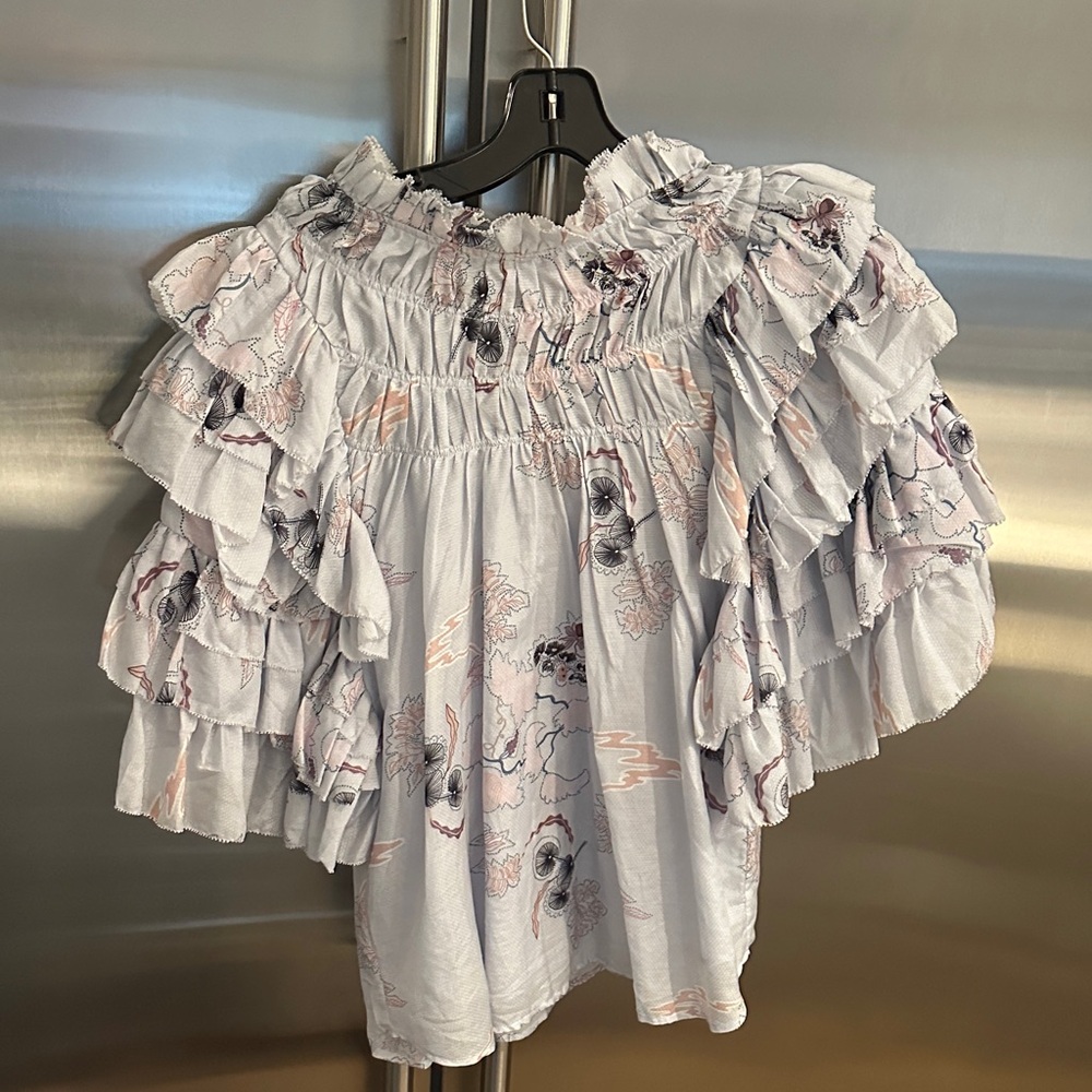 Embrace elegance with this floral ruffle off-shoulder top. Perfect for any occasion, this top features a beautiful design in soft gray tones.