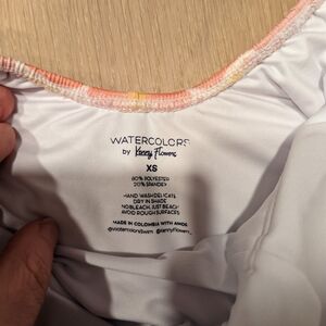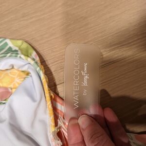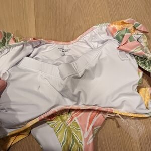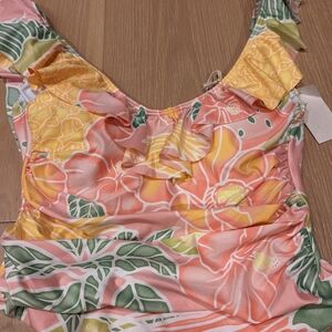 Vibrant floral one-piece swimsuit with ruffle sleeves. Features a mix of pink, green, and yellow colors.