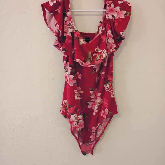 Stylish red bodysuit with floral print and ruffle details. Perfect for a chic look.