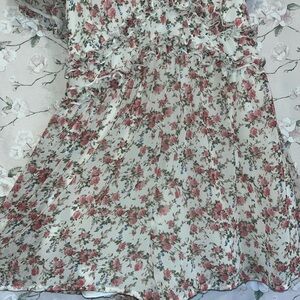 Charming floral romper with ruffle details. Features a mix of pink and green flowers on a white background.