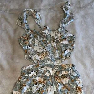 Charming floral romper with ruffle details. Features a mix of blue, white, and brown hues.