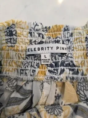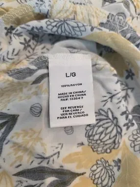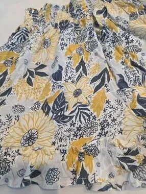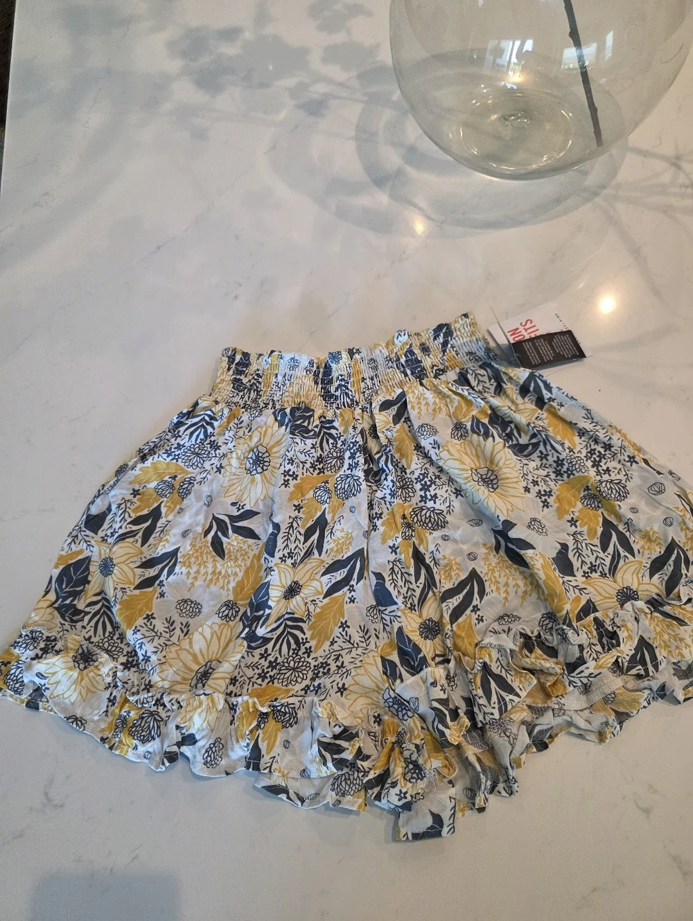 Lightweight floral shorts with ruffle hem. Elastic waistband for a comfortable fit. Features yellow and grwy floral print on a white background. Versatile for casual or dressy looks.