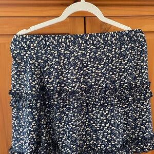 In excellent condition, brand new without tags. No stains, tears, rips, holes, pilling, shrinkage, discoloration or flaws of any kind. 100% Polyester. The fabric has a silk-like texture. A charming floral skirt with ruffle details. It is a navy blue with small white flowers. The centers of the flowers are yellow. On the front and back. It has a ruffled design. Perfect for casual outings. It is a mini skirt. It is great for the spring and summer or warm to hot temperatures. It is great for outings, casual days, dates, vacation, the beach, and more. Bundles of any 2 or more items are 30% off in my closet. Mix or match the categories. Comment with any questions. I am open to offers.