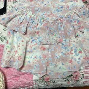 Charming floral ruffle skirt with a pastel design. Features pink, blue, and green hues.