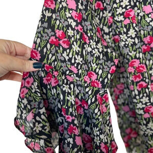 Embrace elegance with this floral ruffle sleeve blouse. Perfect for any occasion, this top features a beautiful blend of pink and black hues. Pair it with your favorite jeans or skirt for a chic look.