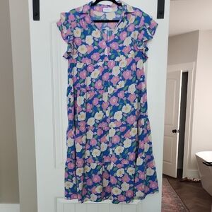 Embrace vibrant style with this floral ruffle sleeve dress. Perfect for any occasion, this dress features a lively mix of blue, pink, and cream hues. Enjoy the comfort and elegance it brings to your wardrobe.