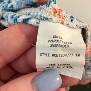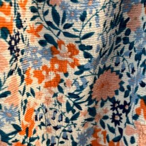 Chic floral top with ruffle sleeves, perfect for any occasion. Features a blend of blue and orange hues for a vibrant look.