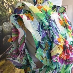 Vibrant floral top with ruffle sleeves, perfect for adding a pop of color to your wardrobe.