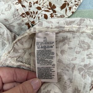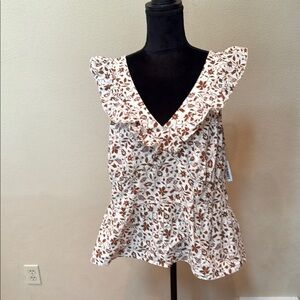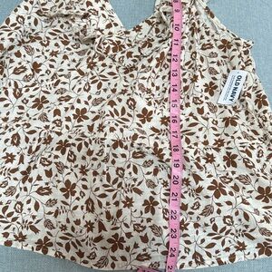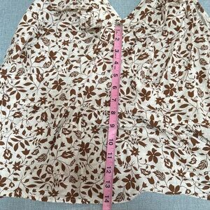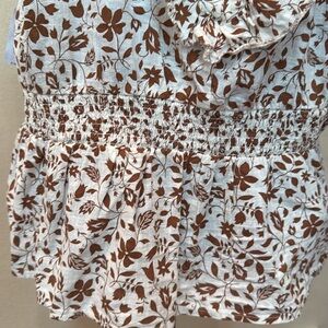 Chic floral top 2x with ruffle sleeves smocked back waist and tie back between shoulder straps. Super cute. Fabric is ivory with henna colored botanical pattern, 100% cotton. Perfect for any occasion. Will keep you cool while looking hot.