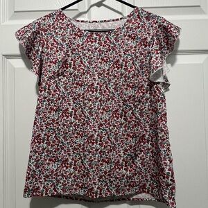 Embrace a fresh look with this floral ruffle sleeve top. The vibrant red and white pattern adds a touch of elegance to any outfit. Perfect for casual outings or a day at the office.