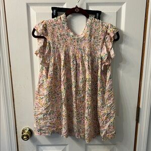 Charming floral top with ruffle sleeves. Features a colorful pattern on a light background.