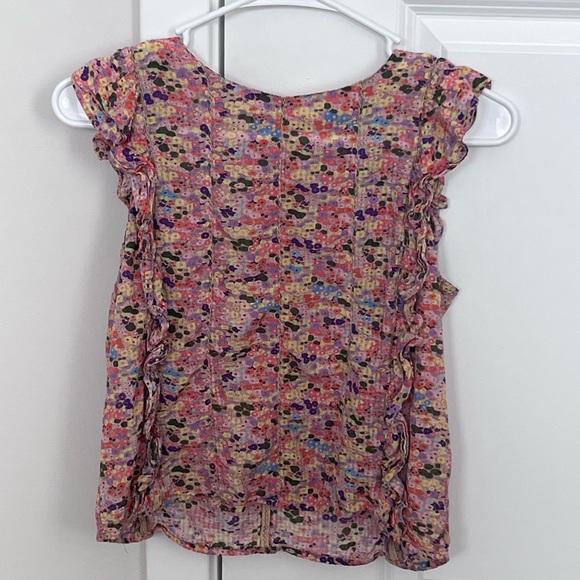 Chic and vibrant floral top with ruffle sleeves. Perfect for adding a pop of color to your wardrobe.
