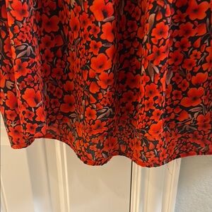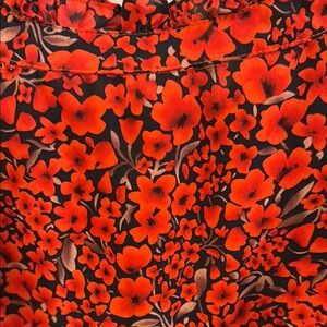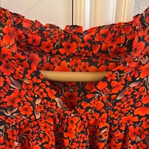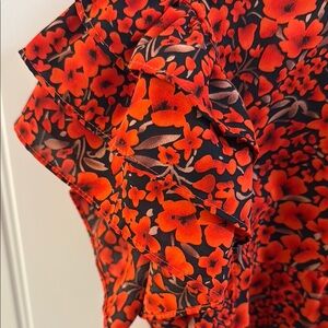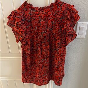This vibrant red floral top features elegant ruffle sleeves, perfect for adding a pop of color to your wardrobe. Ideal for both casual and dressy occasions.