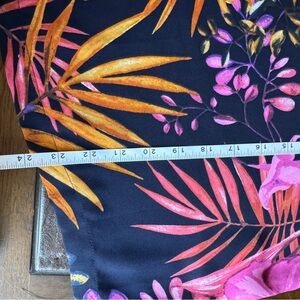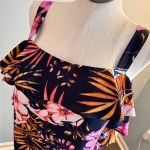 Elevate your style with this chic floral ruffle strap top. Featuring navy blue with vibrant pink and orange hues, it's perfect for any occasion. This is giving south beach vibes!!