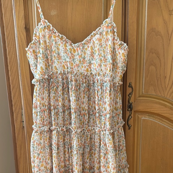 Charming floral sundress with ruffle details. Features a mix of orange, yellow, and green floral patterns on a cream background. Perfect for a sunny day out.