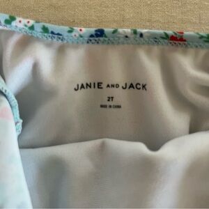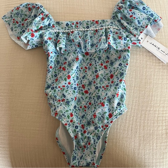 Charming floral swimsuit with ruffle details. Features a mix of blue, red, and green colors.