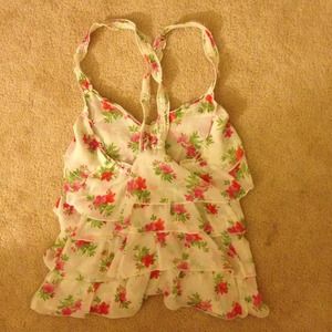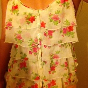 Adorable ruffle floral tank top. V-neck line, ruffle straps. Buttoned front. Straps cross over in back. Perfect for the spring. Bought from hollister and worn only once