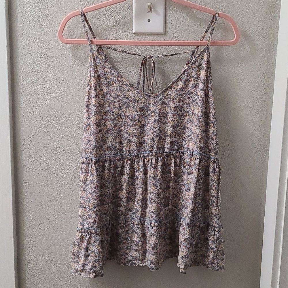 This is a floral tank top with 2 ruffle tiers and a tie back.