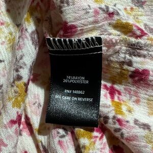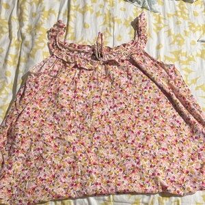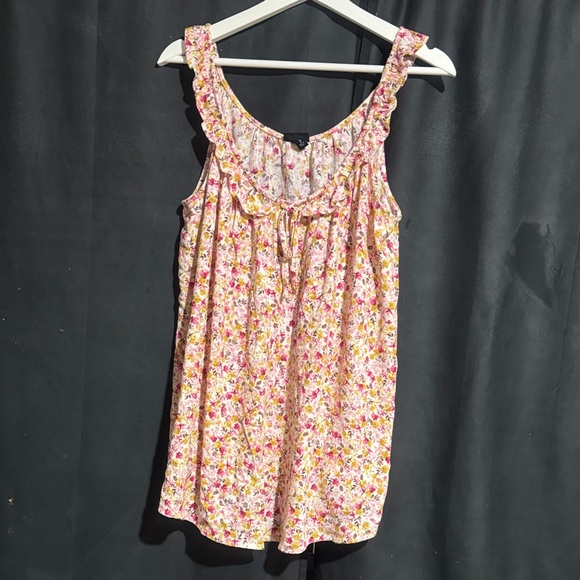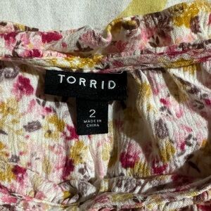 Charming floral tank top with ruffle details. Features a mix of pink, yellow, and white colors. Torrid numbers sizes two