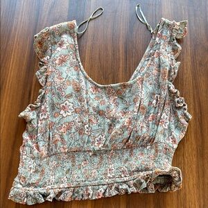 Embrace a chic look with this floral ruffle top. Perfect for any occasion, it features a stylish design in a blend of green and orange hues.