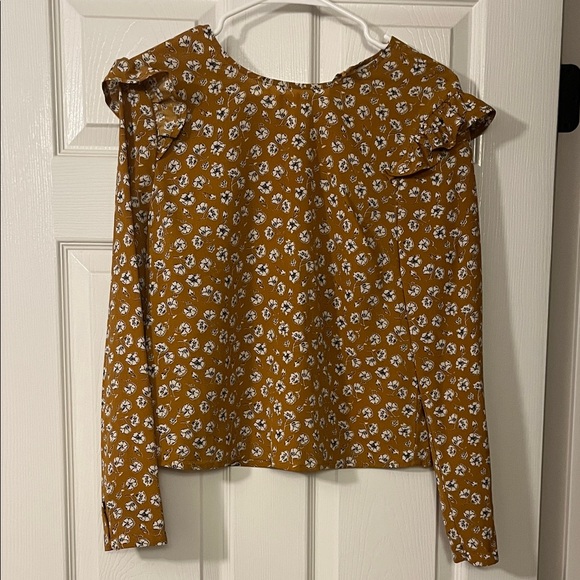 Stylish mustard blouse with floral pattern. Features ruffled sleeves. Ideal for casual outings. NWOT