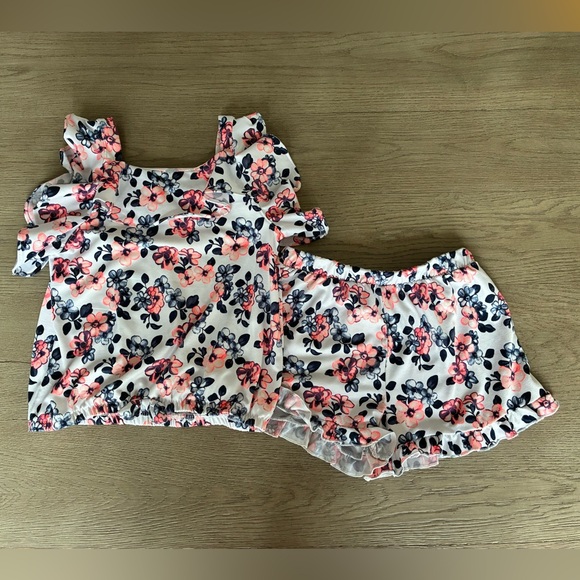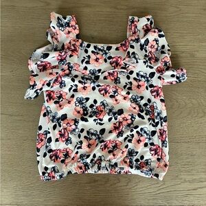 Charming floral top and shorts set with ruffle details. Shorts and top have an elastic waist (top is elastic at the bottom). The top has flutter sleeves l, making it almost sleeveless, and a ruffle bib. A bow on the bottom of the top, as well. My daughter loved this outfit - wore it all the time. Despite that, it still looks new. No flaws ✨
