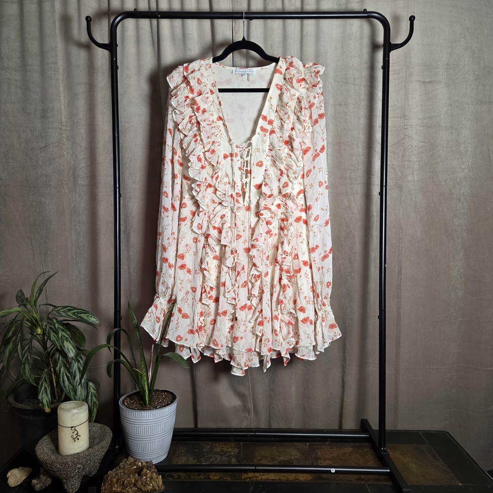 Endless Rose floral ruffle dress Size M #floral #feminine #boho Embrace elegance with this floral ruffle V-neck blouse. Perfect for any occasion, this cream and pink top adds a touch of femininity to your wardrobe.