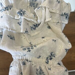 Chic and stylish floral ruffle top in white. Perfect for any occasion. There are some strings hanging, but in good condition. Not quite a crop top, but on the shorter side. Elastic waist band.