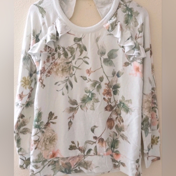 chases Embrace elegance with this floral ruffle women's top. The delicate design features a blend of soft colors, perfect for any occasion. Size M