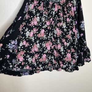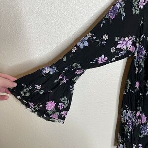 Embrace elegance with this floral ruffle women's top. Featuring a beautiful blend of pink and purple flowers on a classic black background, this top is perfect for any occasion.