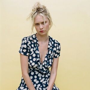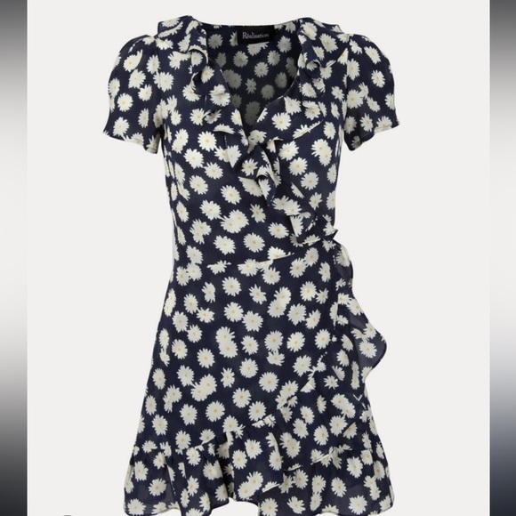 Short sleeve, wrap dress. Ruffle sleeves and hemline. 100% silk.