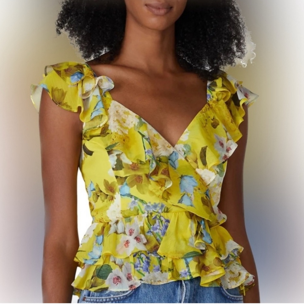 Chic yellow blouse with floral print. Features playful ruffles. Ideal for casual outings. Has a little bit of tape stain on the inside.