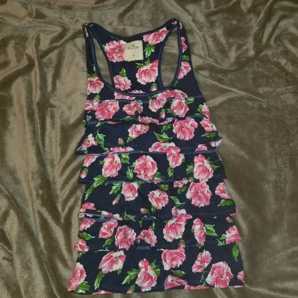 Navy tank with pink floral pattern. Ruffle ties down the front