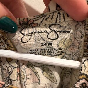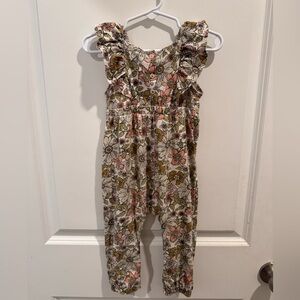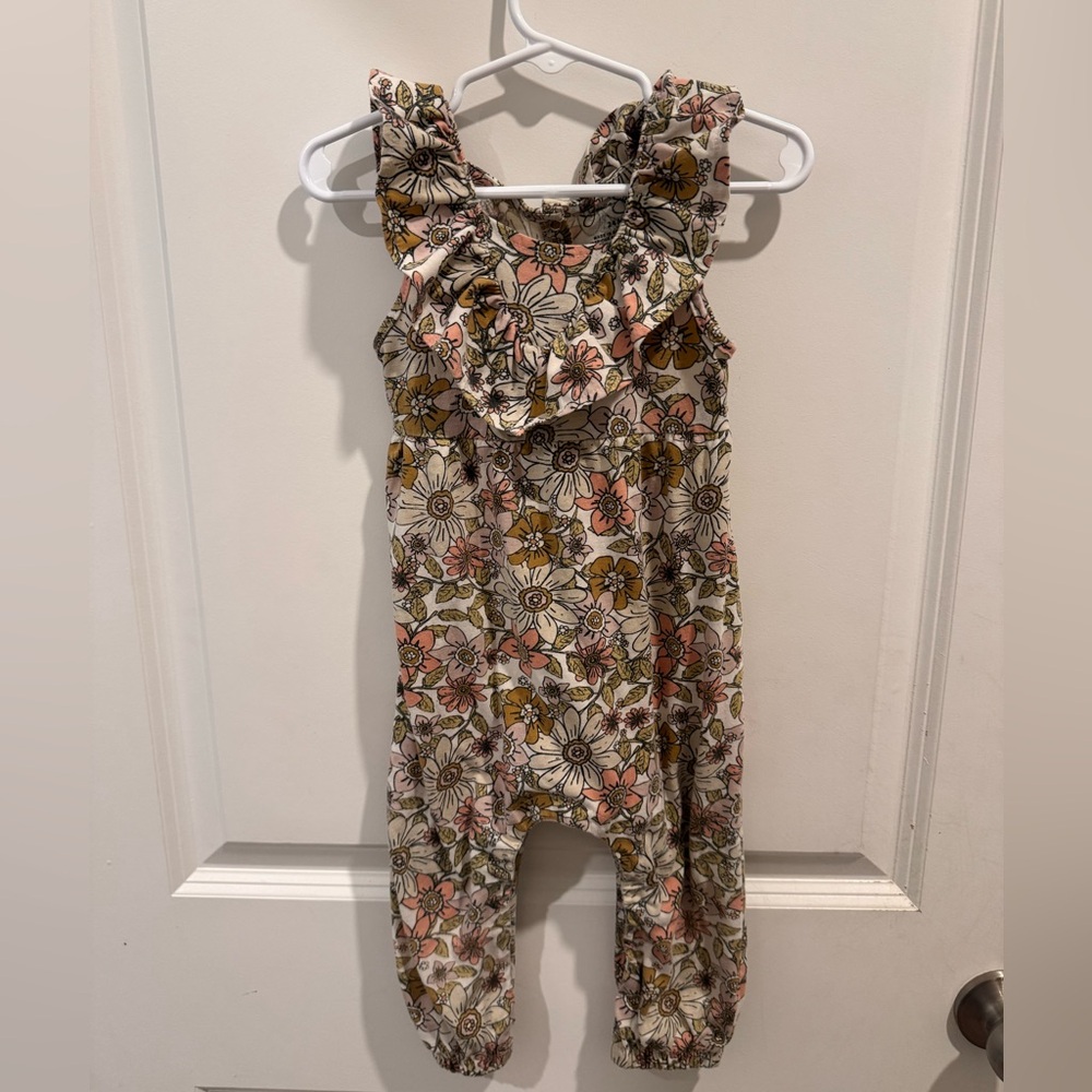 Lightweight floral romper with ruffle neckline. Sleeveless design for warm days. Elasticized ankle cuffs for a snug fit. Snap closure at back and legs for easy diaper changes.