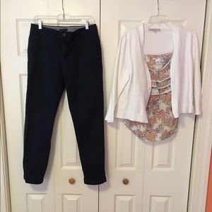 Floral Ruffle-Front Tank with ivory base and blue/ pink: peach floral pattern. Great as statement piece or with sweater. Goes well with pants or skirts. Great condition, like new. 24 inches long from shoulder. Runs slightly small in bust.